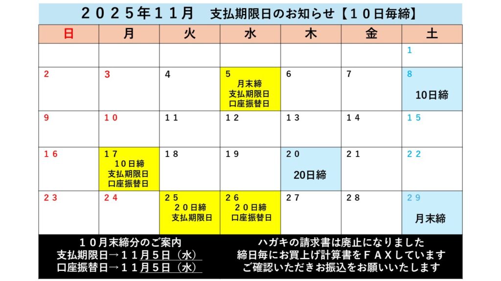 【11月】10日毎締お支払い期限日及び口座振替日のお知らせ 平素より大変お世話になっております。 11月の会計カレンダーをご案内いたします。ご入金が遅れますと売止となりお取引が一時停止となりますので、お支払期限日をご確認頂きますようお願い申し上げます。 記事をシェア 記事をツイート 前の記事へ お知らせ一覧 次の記事へ カテゴリ 本日の入荷量 本日の販売結果 イベント情報 お知らせ お知らせ一覧